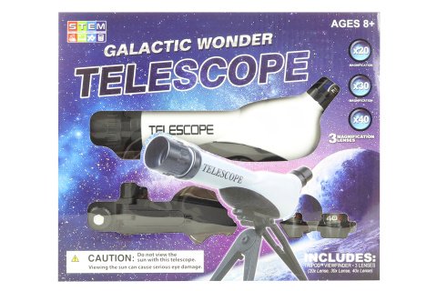 Plastový teleskop se stojanem. Průměr objektivu 60 mm, zaostřovací vzdálenost 170 mm, zvětšení 20x, 30x a 40x. Rozměry balení cca 30,5 x 25 x 6 cm. Věk 8+