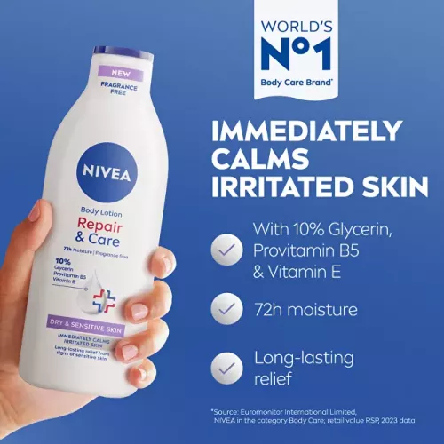 Hydratační tělové mléko Repair & Care poskytuje intenzivní a dlouhotrvající úlevu suché a podrážděné pokožce. Je bez parfemace, a proto je ideální i pro citlivou pleť. Klinicky ověřené složení s obsahem 10 % hydratačních složek účinně zklidňuje a podporuje regeneraci kožní bariéry až na 72 hodin.