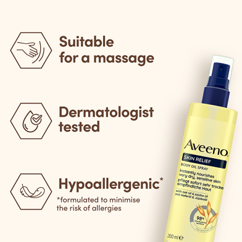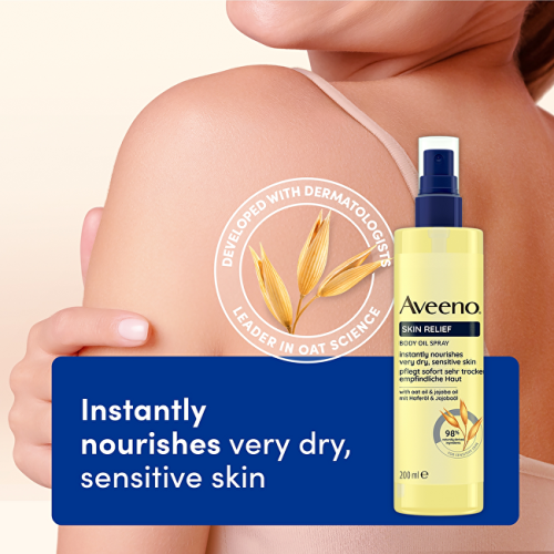 Tělový olej ve spreji AVEENO® Skin Relief má unikátní složení s ovesným a jojobovým olejem. Pomáhá regenerovat a zklidnit velmi suchou pokožku již od prvního použití. Dodává pokožce hedvábný efekt a dlouhotrvající hydrataci. Láhev je recyklovatelná (s výjimkou pumpičky). 98 % ingrediencí přírodního původu.