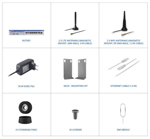 Teltonika RUTXR1; Odolný a výkonný rack LTE Cat6 router s Wi-Fi , který je vybaven dvěma sloty pro SIM, pěti GbE RJ-45 porty a SFP slotem .