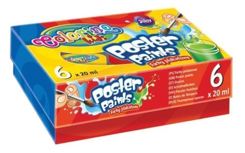 Sada 6 intenzivních temperových barev - bílá, žlutá, černá, červená, modrá, zelená. Kvalitní barvy s vysokým podílem barevných pigmentů, skvěle přilnavé. Každá barva v praktickém kelímku o obsahu 20 ml. Ředitelné vodou. Barvy jsou netoxické. Určeno pro děti od 3 let. Balení: 6 barev.
