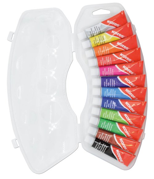 12 intenzivních a zářivých vodových barev v 12ml tubě S vysokou krycí schopností a obalem, který lze uchopit jako malířskou paletu.