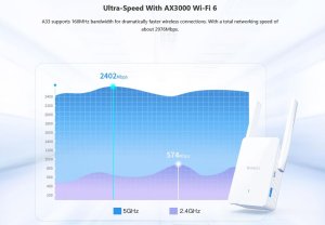 WiFi Extender 802.11ax/ac/a/b/g/n AX3000 (2,4GHz: 574 Mb/s; 5GHz: 2402 Mb/s), 1x Gigabitový LAN port 1000 Mb/s, 2x externí anténa 5dBi, podpora WiFi+ Mesh, MU-MIMO, Repeater / Access Point, WPS, zabezpečení WPA/WPA2/WPA3. Rozšíření stávající WiFi sítě.