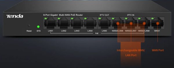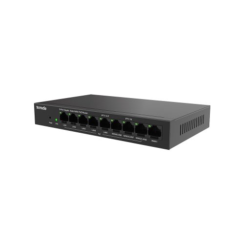 Tenda G0-8G-PoE Gigabit PoE Router je univerzální router včetně PoE switche. MultiWAN, 9x Gigabit RJ45 (3x WAN/LAN, 1x WAN, 5x LAN), 8x LAN PoE+ 802.3 af/at, celkem 95W. Podporuje management až 128x WiFi AP Tenda i21, i24, i25, i27, i29, a dalších. Fast Roaming IEEE 802.11k/v/r, VPN IPSec, PPTP, L2TP, Smart Bandwidth control, DHCP server.