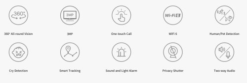 Vnitřní IP kamera s AI detekcí pohybu, WiFi 6, a 2K rozlišením 2304 x 1296 (3MP), zabezpečení WPA3-SAE, přenosem zvuku, rotace 360° horizontálně a 155° vertikálně, noční vidění s dosvitem 12 m, sledování S-Motion + S-tracking, vestavěný mikrofon, vestavěný reproduktor a siréna, cloud platforma, slot pro SD kartu max. 256 GB, detekce pláče, volání pomocí jednoho tlačítka, aplikace pro Android a iOS v češtině.