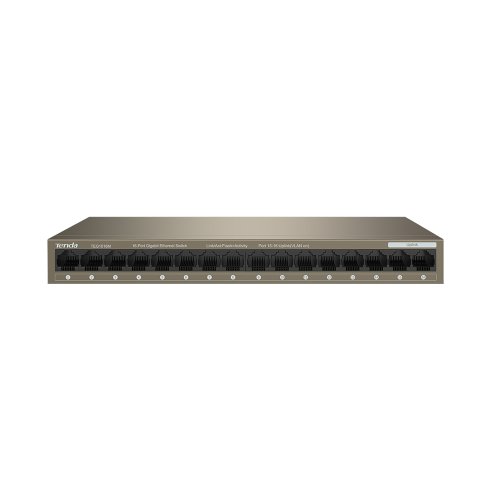 Tenda TEG1016M přepíná data v síti pomocí 16ti portů RJ45 s přenosovou rychlostí 10/100/1000 Mb/s a automatickou detekcí rychlosti. Maximální propustnost je 32 Gb/s. Auto MDI/MDIX na každém z portů. Přepojování uzlů v režimu Store-and-Forward. Full-duplex kontrola toku 802.3x. Navíc obsahuje tlačítko pro zapnutí VLAN.