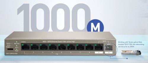 Tenda TEG1110PF-8-102W je 9ti portový Gigabitový Ethernet PoE switch s napájením PoE af/at a SFP portem. 8 portů 10/100/1000 Mb/s je napájeno pomocí PoE 802.3af/PoE 802.3at (celkem 92 W), pro Uplink 1x RJ45 10/100/1000 Mb/s + 1x SFP port 100/1000 Mb/s. Ochrana proti přepětí 6 kV. Přepínání VLAN, Extend, Standart. Kovový obal. Fanless, bez ventilátorů.