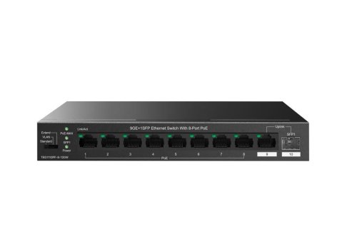Přepínač Standart / Priority / Extend / VLAN mode Tenda TEG1110PF-8-120W obsahuje přepínač pro výběr ze tří režimů: Standart / VLAN / Extend mode. Standardní režim: V tomto módu pracuje jako klasický switch, veškeré porty mají auto-negaci, všechny porty spolu komunikují, Port1 až Port9 rychlost 10/100/1000 Mb/s, SFP port rychlost 100/1000 Mb/s. Režim VLAN: V tomto módu jsou Port1 až Port8 izolované samy od sebe, každý port Port1 až Port8 může komunikovat pouze s uplinkovými porty Port9 a SFP1. Tento mód velkého šíření vysílání a DHCP spoofingu. Extend mode: Rychlost PoE portů Port1 až Port8 je max. 10 Mb/s, auto-negace aktivní a je navýšen dosah ke koncovému zařízení až na 250m (záleží také na koncovém zařízení, kabeláži, apod.). Všechny porty switche spolu navzájem komunikují.