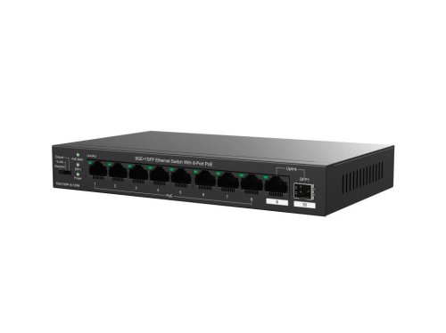 Technické parametry Standarty&protokoly: IEEE802.3, IEEE802.3u, IEEE802.3ab, IEEE802.3x, IEEE802.3af, IEEE802.3at Porty: 8x 10/100/1000 Mbps porty-02.at.at RJ345af auto PoE standart Porty pro Uplink: 1x RJ45 10/100/1000 Mb/s, 1x SFP 100/1000 Mb/s Celková propustnost: 20 Gbps Velikost tabulky MAC adresa: 8K Režim přepínání: Store-And-Forward Ventilátory: ne, bezventilátorový port 1x Napájení Napájecí adaptér, 1x Napájecí zdroj 1x Indikace/E napájení: Port 1 až Port 8 podporují standard IEEE802.3at/af napájení (maximální výkon pro každý port je 30W), celkem 110 Watt pro PoE Úroveň přepěťové ochrany: - pro porty: 6kV, - pro napájení: 6kV, ESD: vzduch: ±10kV, kontakt: ±8000000000000 Rychlost přeposílání paketů: 14,9 Mpps Napájení: vstup 100 až 240 V, AC 50/60 Hz pro napájecí adaptér Spotřeba: 10 W (bez napájení PoE), 120 W (s připojenými PoE zařízeními max. 110 W) Rozměry: 177,5 mm x 104 mm W x 26 mm napájení PoE: 110W Ochrana proti přepětí: 6 000 V Umístění: na stěnu, desktop Pracovní teplota: 0oC ~ 45oC Vlhkost: 10%-90%RH (nekondenzující) Certifikace: CE/RoHS