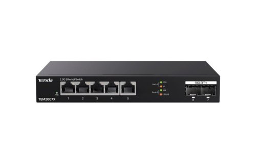Tenda TEM2007X je 5ti portový 2.5G Ethernet switch a 2x 10G SFP+ porty. 5x RJ45 port 100/1000/2500 Mb/s + 2x SFP+ port 1000/2500/10 000 Mb/s. Propustnost 65 Gb/s, ochrana proti přepětí 6 kV, tabulka pro MAC adresy 16K. Kovový obal.