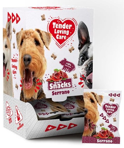 Pamlsky Duvo+ Tender Loving Care jsou velmi chutné a měkké pamlsky pro psy. Jsou vyráběny v EU a neobsahují žádná umělá barviva ani aromata. Tato bezlepková variata se šunko Serrano obsahuje víc než 70 % čerstvého masa, rýže a oreganového oleje pro optimální strukturu a chuť. Hypoalergenní přípravek bez genetických modifikací jeideální pro trénink psa. Jsou vhodné pro všechny psy od šesti měsíců. Výhody: Vysoký obsah čerstvého masa (70 %). Bez umělých aromat a barviv. Vyrobeno v EU. Bezlepkové, bez GMO a hypoalergenní. Ideální na trénink. Složení: Maso a produkty živočišného původu (24,5 % šunka), obiloviny (7,7 % rýže), vedlejší výrobky rostlinného původu, minerální látky. Analytické složky: Hrubý protein 24,2 %, obsah tuku 11,3 %, hrubá vláknina 1,48 %, hrubý popel 11,9 %. Doplňkové látky: obsahuje EU povolená konzervanty a antioxidanty. Krmný návod: Doporučujeme podávat pod dohledem, slouží jako doplnění běžné krmné dávky. Zajistěte psovi vždy dostatek pitné vody. Není určeno pro lidskou spotřebu.