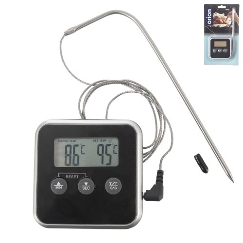 Kuchyňský digitální teploměr se sondou a kuchyňská minutka v jednom je skvělý pomocník nejen při přípravě masa. Využít jej můžete při grilování na grilu, pečení masa v troubě, při uzení v udírně, při chlazení potravin v lednici, při vaření džemů, sirupů, karamelu... Teploměr umožňuje nastavit teplotní alarm při dosažení požadované teploty. Jakmile teplota pokrmu dosáhne zvolené teploty, ozve se zvukový signál. Nebo můžete zvolit režim minutky, které klasicky odpočítá nastavený čas a o jeho konci vás informuje zvukový signál. Možnost nastavení jednotky teploty °C/°F. Rozsah měření teploty od -20 °C do +300 °C, rozsah časovače 99 min 59 sec. Možnost zavěšení, postavení pomocí stojánku nebo přichycení magnetem na zadní straně teploměru. Přepínač časovače a měření teploty na zadní straně teploměru (COOK/TIMER). Napájení 1x 1.5V AAA baterie (není součástí). Materiál plast ABS, nerez s/s 304, silikon (tlačítka), kov, magnet. Návod k použití součástí výrobku. Rozměry 8 x 8 x 2 cm, délka sondy 16 cm, lanko k sondě délka 93 cm, velikost displeje 4.5 x 2 cm. EAN 8592381185374