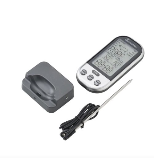 Bezdrátový rádiový teploměr, dosah 30 metrů. Velký dobře čitelný displej. Možnost nastavení 8 druhů masa a 5 různých úrovní grilování. Nastavení cílové teploty. Automatický alarm při dosažení zvolené úrovně vaření. Funkce stopek a odpočítávání. Počet tužkových baterií: 4 AAA (nejsou součástí balení). Šířka 6 cm, výška 12 cm, hloubka 2.5 cm. EAN 4000810136254