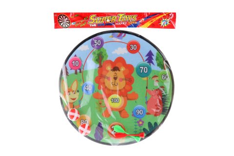 Terč s motivem zvířátek. Průměr 35 cm. Materiál karton+látkový potah. Balení obsahuje 2 míčky a 2 šipky z plastu. Baleno v sáčku. Rozměry balení cca 37x42x4 cm. Věk 3+