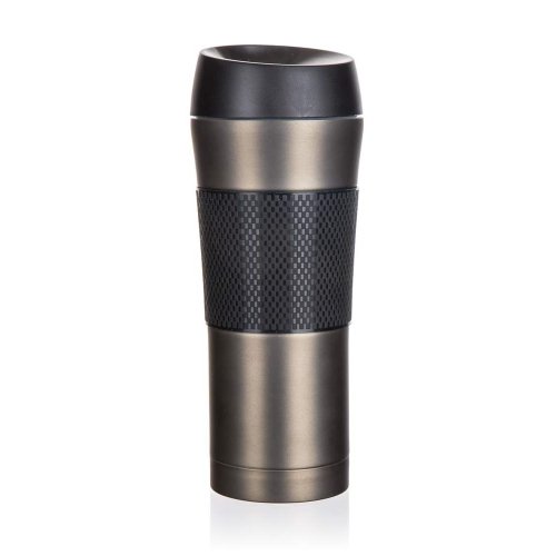 Cestovní hrnek AKCENT dvoustěnný, je vhodný na teplé i studené nápoje. Vnější část z nerezu 201 v kombinaci s černým silikonovým rukávem a vnitřní část z nerezu 304. Využitelný objem je 420 ml.