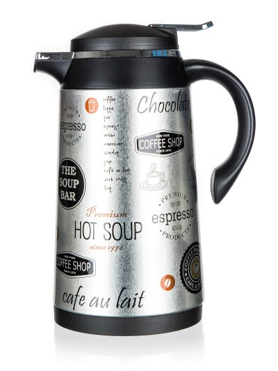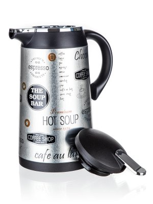 objem: 1 l průměr: 13 cm výška: 26 cm materiál: kov s potiskem, plast PP (víčko a držadlo), pochromovaný ABS plast, silikonové těsnění, skleněná vložka (bezazbestová)