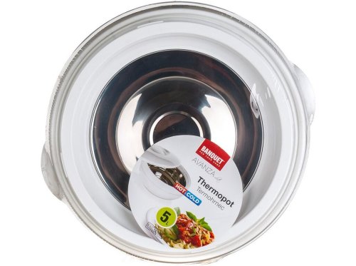 Termohrnec s poklicí AVANZA 5 l, barva bílá je praktický pro uchovávání teplých pokrmů. Ocení ho hlavně kuchaři a kuchařky při uskladnění hotových pokrmů před samotným servírováním.Termohrnec se vyrábí v několika velikostech. Vnitřek hrnce tvoří nerezová vložka, výplň mezi stěnami je z PUR pěny pro zachování vynikající izolace při skladování či přenášení potravin.