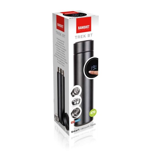 Cestovní chytrá termoska TREK BT o objemu má vnější i vnitřní povrch z nerezu a plastové víčko. Ve víčku je zabudovaný digitální teploměr, který vám po poklepání ukáže aktuální teplotu vašeho nápoje. Díky dvoustěnnému provedení si udrží nápoj déle svou teplotu.