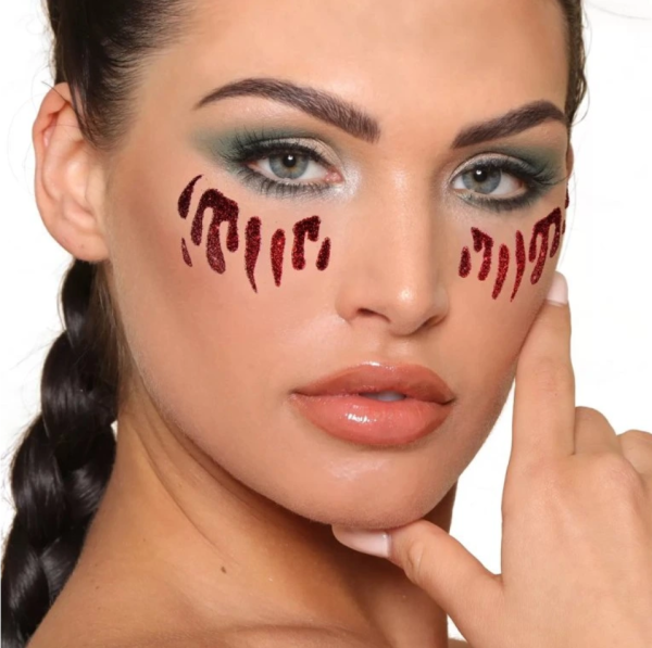 Krvavé slzy jsou samolepicí a snadno se nanášejí na obličej. Jsou vyrobeny z netoxického materiálu, jsou šetrné k pokožce a na světle se třpytí.