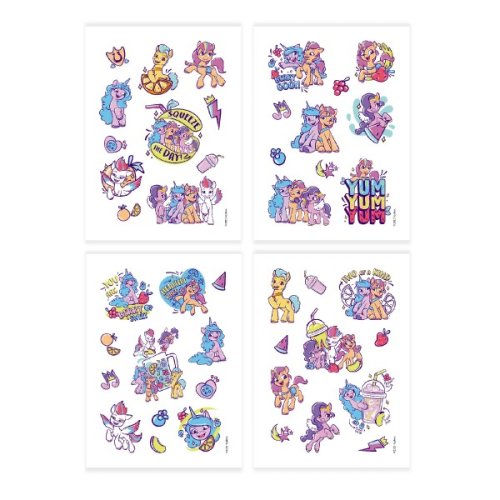 Tetování s motivem My Little Ponny. Vyber si obrázek, nalep na místo, kde ho chceš mít, jemně potři vodou, sloupni papírek a je to! Rozměr obalu: 10,5 x 15 cm Vhodné pro děti od 3 let