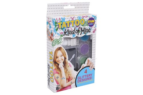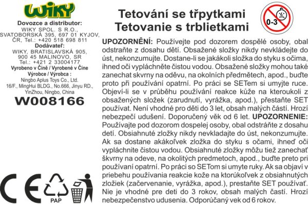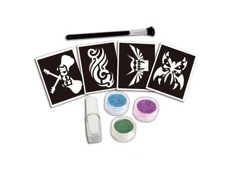 štěteček 4 šablony (lze použít opakovaně) tetovací lepidlo třpytky ve 3 barvách návod Doporučený věk: 6+