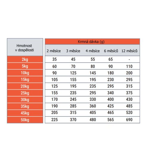 Složení: obiloviny, maso a vedlejší výrobky živočišného původu (z toho 4 % hovězí), vedlejší výrobky rostlinného původu, živočišné tuky, sušená mrkev 0,54 %(odpovídá 4 % mrkve), minerální látky, vitamíny, hovězí příchuť.