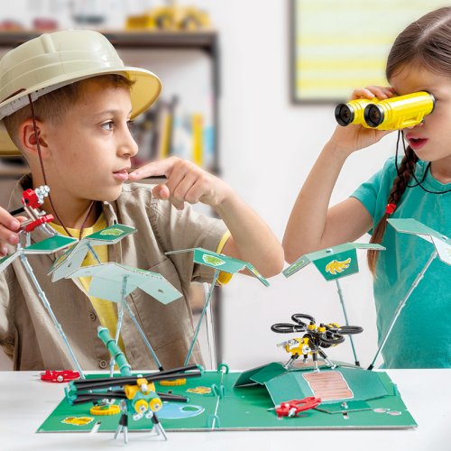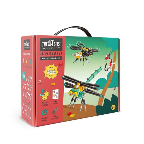 Džungle ožívá díky třem jedinečným kamarádům a novému hřišti, které si můžeš postavit z kartonu OffBits. Postavte si BeeBit, MonkeyBit a DragonflyBit a přeměňte karton na hřiště Jungle, kde si všechna zvířátka mohou hrát společně ve svém přirozeném prostředí. Sada obsahuje více než 200 barevných matic, šroubů, tvarovaných kousků, samolepek a naše víceúčelové balení s nulovým odpadem, které se promění v součást herního zážitku a stane se džunglí. Popusťte uzdu své fantazii. Tato sada umožňuje vytvoření čtyř modelů s dalšími nekonečnými možnostmi pro vaše vlastní kreativní nápady. Jedná se o hračku, která pomáhá mladým lidem růst v oblastech vědy, technologie, inženýrství, umění a matematiky. Hračky OffBits také podporují rozvoj jemné motoriky, prostorové představivosti, řešení problémů a nápadité hry. Co můžete postavit:BeeBit, MonkeyBit, DragonflyBit plus nekonečné množství jedinečných výtvorů, které můžete postavit pomocí své fantazie. Máte kolem sebe karton, šroubky nebo jiné zábavné materiály? Vylepšujte s předměty každodenní potřeby a vytvořte také své vlastní jedinečné vynálezy. Hlavní vlastnosti: obsahuje nářadí pro sestavení stavebnicekompatibilnost s každodenními předmětyrozvoj kreativity, jemné motoriky i logického myšlenívhodné od šesti letvíce než 200 dílůobal je součástí herního zážitku