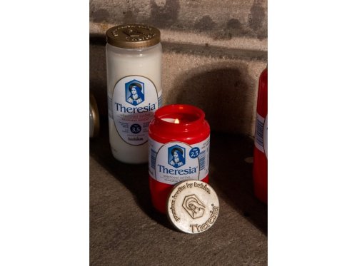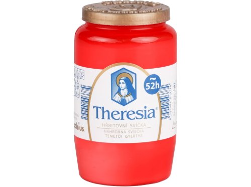 Kompozitní svíčka Theresia v červené barvě, ideální pro výzdobu hrobů. Hoří až 2,5 dne.