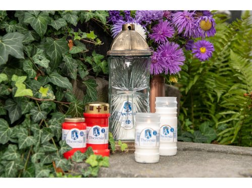 Kompozitní svíčka Theresia v bílé barvě, hoří až 4,5 dne.