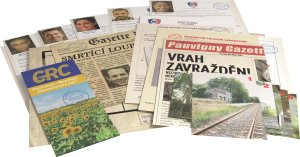 policejní poznámky, výstřižky z novin, fotografie a výslechy podezřelých, půdorys budovy, fotografie z místa činu, místní mapy, jízdní řády, pitevní a laboratorní zprávy a další důkazy.