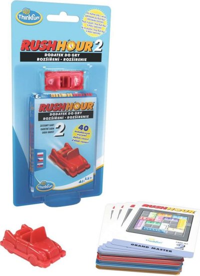 40 dalších výzev! Rozšíření hry Rush Hour (Bláznivé parkoviště) nabízí k vaší původní hře dalších 40 karet s výzvami a nové únikové auto. Posouvejte blokující auta a náklaďáky v pruzích nahoru a dolů, vpravo a vlevo, dokud neuvolníte cestu k úniku červenému autu nebo červenému kabrioletu. Vozidly lze pohybovat dopředu a dozadu, ale ne do stran. Pouze k použití s hrou Rush Hour (Bláznivá parkoviště).