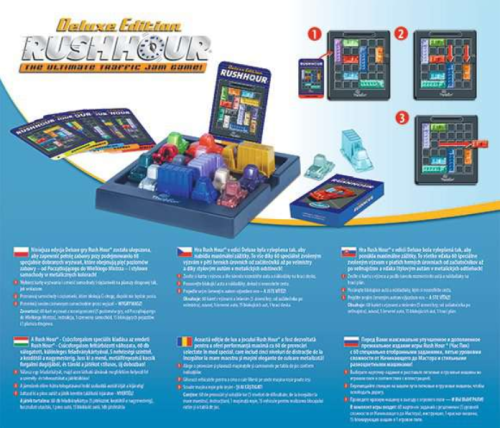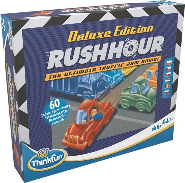 Hra Rush Hour v edici Deluxe byla vylepšena tak, aby nabídla maximální zážitky ze hry. To vše díky 60 speciálně zvoleným výzvám v pěti herních úrovních od začátečníků až po velmistry a díky stylovým autům v metalických odstínech! Posouvejte blokující auta a náklaďáky v pruzích nahoru a dolů, vpravo a vlevo, dokud neuvolníte cestu k úniku červenému autu. Vozidly lze pohybovat dopředu a dozadu, ale ne do stran. Obsahuje: 60 karet s výzvami a řešením (5 úrovní hry; od začátečníka po velmistra), návod, 1 červené auto, 15 blokujících aut, 1 hrací deska.