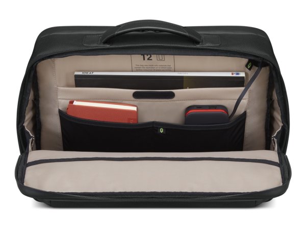 *Přihrádka na počítač podporuje notebooky s úhlopříčkou až 16" a má samostatnou polstrovanou kapsu na další menší zařízení. *Hlavní přihrádka je vybavena plnohodnotnou pracovní stanicí a úložnými kapsami na příslušenství a další drobnosti, včetně kapsy s blokováním RFID a klíčenky *Voděodolné materiály, vyztužené voděodolnou páskou na zipu, abyste se vyhnuli nepřízni počasí *Další úložná kapsa na předním panelu pro další úložné prostory *Jediná pohodlná rukojeť usnadňuje dojíždění *Vnější část vyrobena z 89 % z recyklovaného materiálu, což odpovídá 12 500ml lahvím na vodu (předpoklad 19 gramů na láhev)
