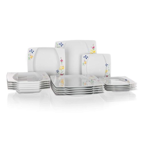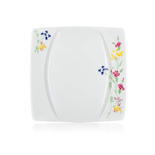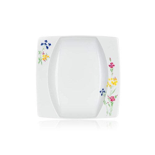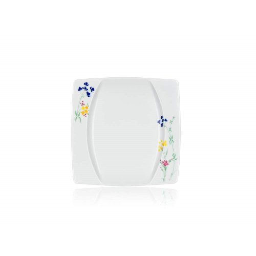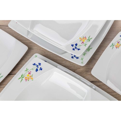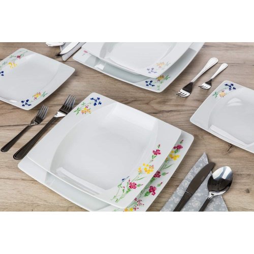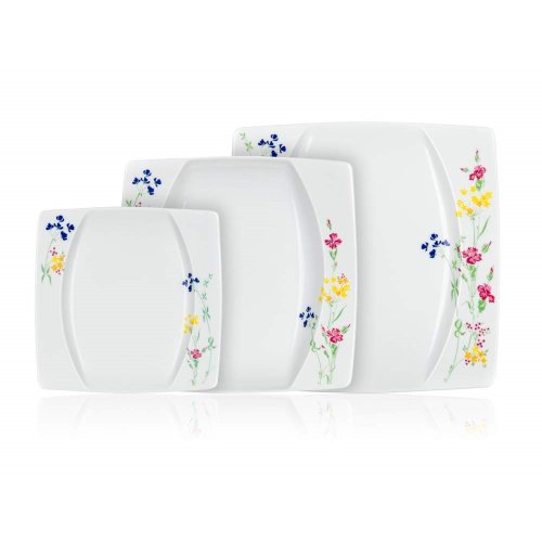 18dílná porcelánová talířová sada square, vyrobena v české porcelánce Thun. Sada obsahuje: 6 x mělký talíř o rozměru 27 x 27 cm, 6 x hluboký talíř o rozměru 23 x 23 cm a 6 x dezertní talíř o rozměru 18,5 x 18,5 cm. Talíře lze používat do mikrovlnné trouby a mýt v myčce na nádobí.
