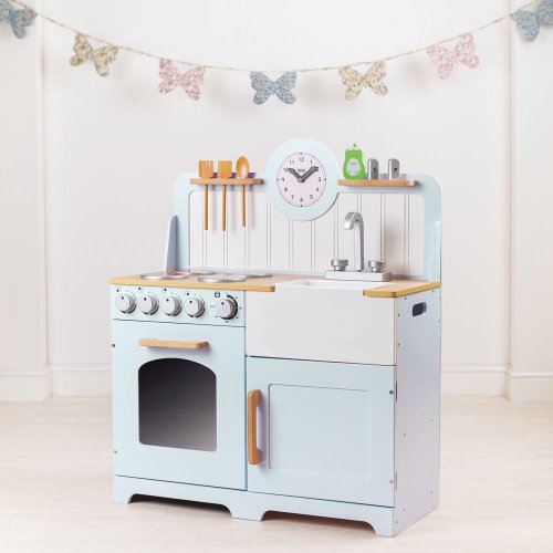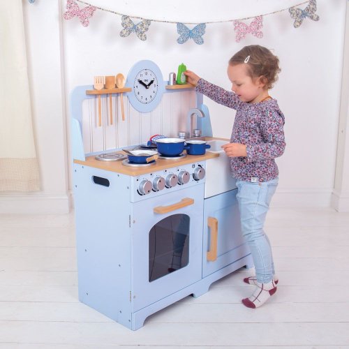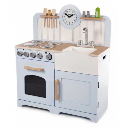 Mladí nastávající kuchaři si užijí vaření a pečení s touto dřevěnou kuchyní! Je vybavena čtyřmi varnými deskami, které jsou ovládány otočnými ciferníky, které vydávají klapavý zvuk. Obsahuje také troubu s policí a průzor, aby mladí kuchaři mohli jídlo kontrolovat. Dále úložnou skříňku, dřez, nádobí, které se dá zavěsit (viz obrázek), sůl a pepř a nakonec hodiny s otočnými ručičkami. Kuchyňka má vyšší desku a tak rostoucím dětem vydrží více let. Na boku má rukojeti k lehčímu uchopení. Skvělý způsob jak děti naučit bezpečnosti v kuchyni a zdravé stravě. Podporuje kreativní a představivou hru. Rozvíjí koordinaci ruka-oko a zručnost. Po vybalení je nutno složit. Vyrobeno z kvalitních materiálů z odpovědných zdrojů. Odpovídá evropské bezpečnostní normě. Hlavní vlastnosti: otočné zvukové ciferníkyvyšší pracovní plochalehčí přenášení díky bočním úchytům3 ks kuchyňského náčiní (solnička s pepřenkou, plastová miska v dřezu, přípravek na mytí nádobí)podporuje kreativitu a představivost