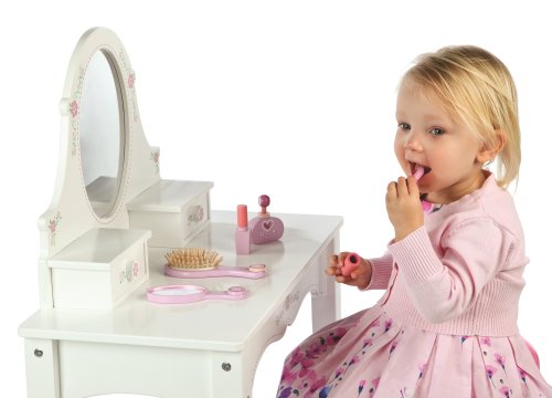 Kosmetický stoleček je perfektním doplňkem každé ložnice či herny. Se svou krásnou květinovou dekorací a vestavěným oválným zrcadlem bude děti inspirovat k hodinám kreativní hry – ať už zkrášlují sebe samé nebo někoho jiného. U stolečku se mohou připravit na svůj den, udělat si účes, prostě si užít mnoho zábavy. Stůl je v balení se stoličkou a dvěma šuplíky, kam si děti mohou uložit své doplňky. Vysoce kvalitní s robustní konstrukcí, tento stoleček toho vydrží mnoho. Doplňky nejsou součástí balení. Po vybalení je nutno složit. Vyrobeno z kvalitních materiálů z odpovědných zdrojů. Odpovídá evropské bezpečnostní normě. Hlavní vlastnosti: zabudované zrcadlo2 zásuvkyrobustní konstrukce