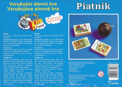 Rychlá slovní hra Tik Tak Bum Junior podporuje kreativitu, spontánnost a slovní zásobu. Zapni bombu, odkryj kartu, řekni slovo, které souvisí s obrázkem na kartě a předej rychle tikající bombu dalšímu hráči. Vhodné od 5 let.