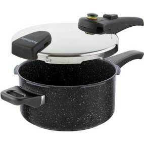 Tlakový hrnec z nerezavějící oceli BLACK GRANITEC s oboustranným nepřilnavým povrchem se vyznačuje snadnou obsluhou, jednoduchou údržbou a dlouhou životností.