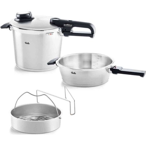 Tlakový hrnec Vitavit Premium s objemem 6 l a tlakový pánev s objemem 2,5 l od Fissler.