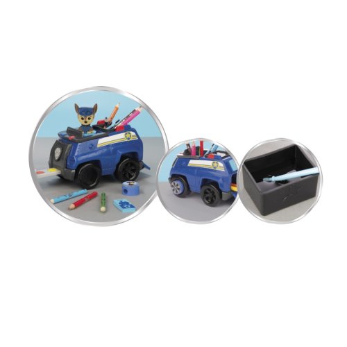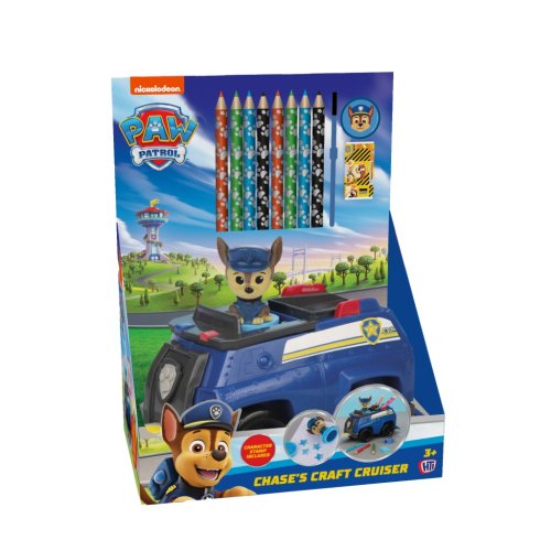 Autíčko Chase z Tlapkové Patroly jako praktický stojánek plný kreativních potřeb. Sada obsahuje štětec, razítko, 4× vodovou barvu, ořezávátko, gumu a 8× pastelku.