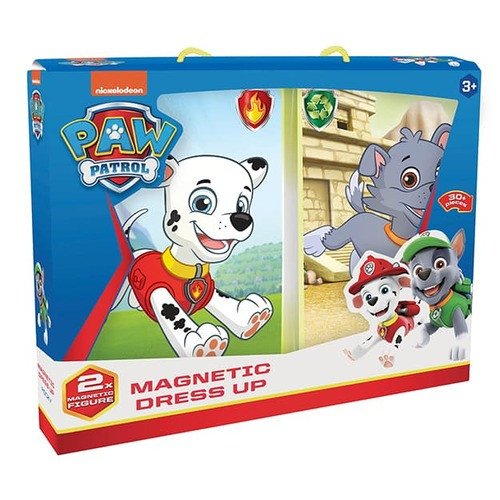 Balení obsahuje 2 magnetické pejsky, 2 dřevěné stojánky, 2 barevná pozadí a 2 listy s magnetickými oblečky a doplňky v oblíbené licenci Tlapková patrola.