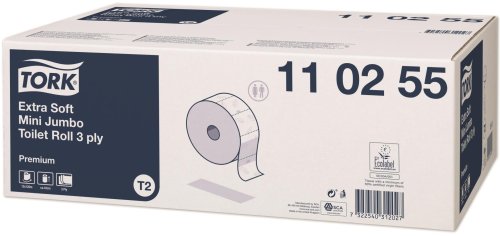 Toaletní papír TORK Mini Jumbo extra jemný Tork systém T2 3 vrstvý Materiál: celulóza/recykl Návin role 120 m Průměr role 18,7 cm Šířka role 9,7 cm Počet útržků 600 Délka útržku 20 cm Průměr dutinky …