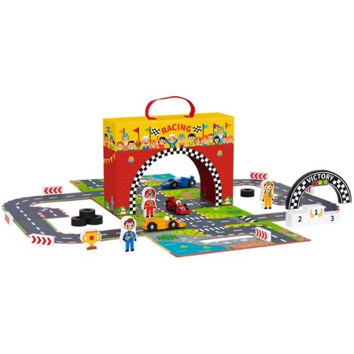 Dětská závodní dráha v praktickém kufříku obsahuje 34 dílů Souprava potěší všechny milovníky autíček a formulí Kufřík je skladný a přesto skrývá spoustu zábavy – 33 různých figurek, autíček, pneumatik, puzzle závodní dráhu a další doplňky Samotný kufřík se při hrání zároveň stává součástí závodní dráhy Děti všechny díly rozloží, poskládají závodní okruh a mohou se pustit do závodění