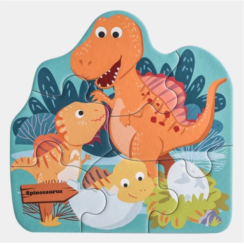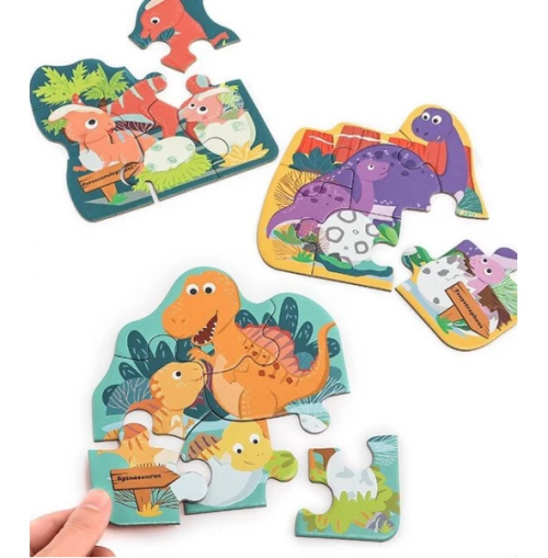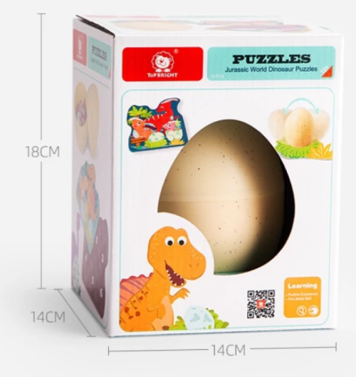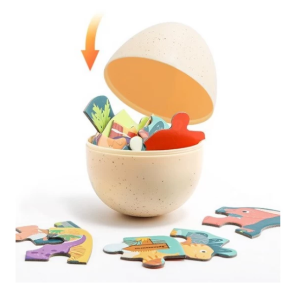 Sada 3 puzzle s dinosaury po 6 dílcích, pro snazší třídění a skládání mají dílky jednotlivých obrázků ze zadní strany stejný potisk a jsou očíslovány, vejce je vyrobeno z plastu, snadno se otevírá a slouží pro ukládání puzzle nebo jiných pokladů.