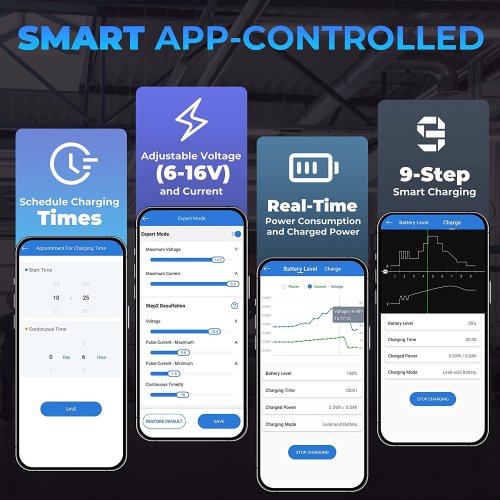 Kompatibilní se všemi typy 6V a 12V olovo-kyselinových baterií a 12V lithiových baterií (LiFePO4). Podporuje i více typů baterií: LI, zaplavené, gelové, MF, CAL, EFB, AGM.