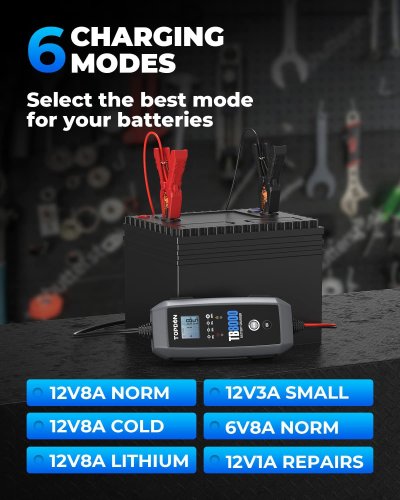 Nabíječka baterií TOPDON TB8000 nabízí dva nabíjecí proudy 8A a 3A pro baterie od 15Ah do 260Ah. S tímto Jedinečným nástrojem budete moci nabíjet baterie v automobilech, motocyklech, jachtách, nákladních automobilech, SUV, MPV, traktorech a mnoha dalších. Díky 6-ti nabíjecím režimům, 12V/8A Norm, 12V/8A Cold, 12V/8A Lithium, 12V/3A Small Norm, 6V/8A Norm a 12V Repair, si vyberete ten, který bude nejvíce vyhovovat Vašim potřebám!