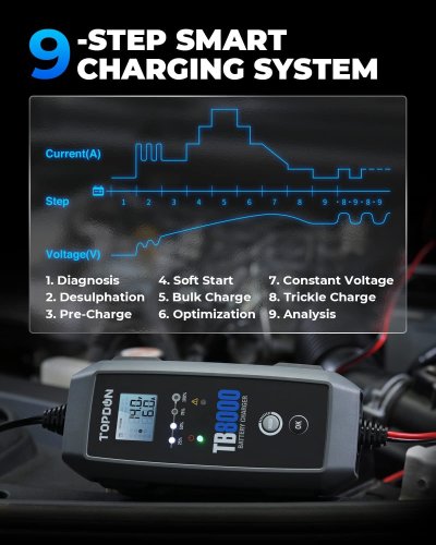 9stupňový systém inteligentního nabíjení TB8000 poskytuje uživatelům špičkovou technologii, která automaticky identifikuje stav baterie a dodává nejvhodnější proud. S tímto zařízením se již nemusíte obávat poškození baterií!