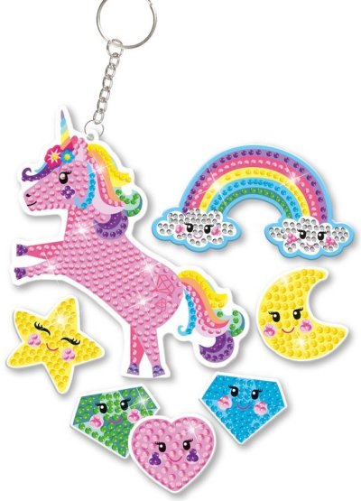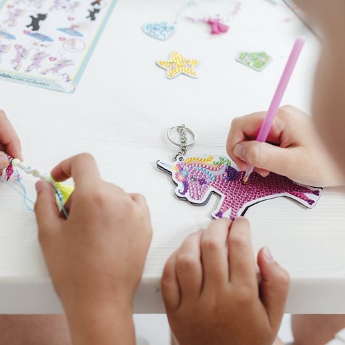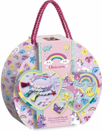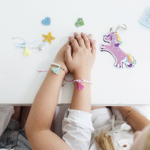 Vytvořit až 9 magnetů s motivem jednorožce – pomocí více než 1 400 diamantových kamínků a přiložených samolepek. Vyrobit až 3 náramky s korálky, písmeny, saténovým provázkem a dekoracemi jako srdce či třásně.