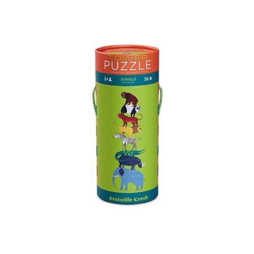 Puzzle ve tvaru věže v kulaté krabici s uchem. S motivem divokých zvířat, která si složíte na sebe podle velikosti. Věk 3+