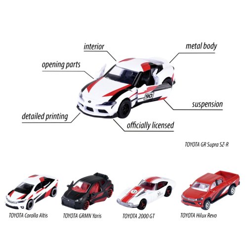 Dárková sada kovových autíček z kolekce Toyota Racing na volnoběh, otevírací části. Balení obsahuje 5 ks: Toyota GR Supra, Toyota GRMN Yaris, Toyota Hilux Revo, Toyota Corolla Altis, Toyota 2000 GT v barvě černé, bílé a červené. Délka autíčka 7,5 cm. V měřítku 1:64.